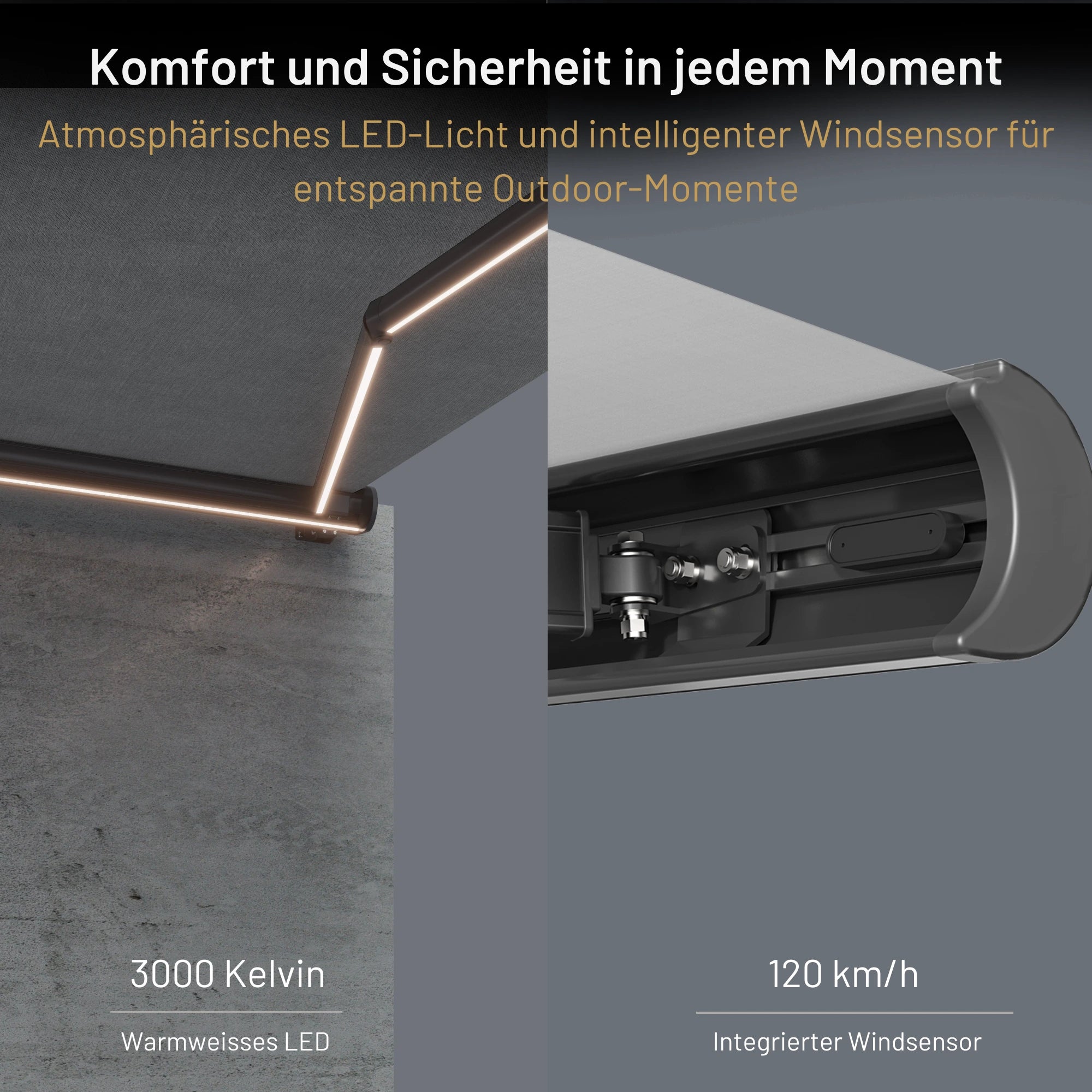 Ja, die SkyShade ist serienmäßig mit warmweißen, dimmbaren LED-Streifen ausgestattet. Diese sind elegant in der Kassette integriert und sorgen abends für ein stimmungsvolles Ambiente – perfekt für lange Sommerabende auf der Terrasse.