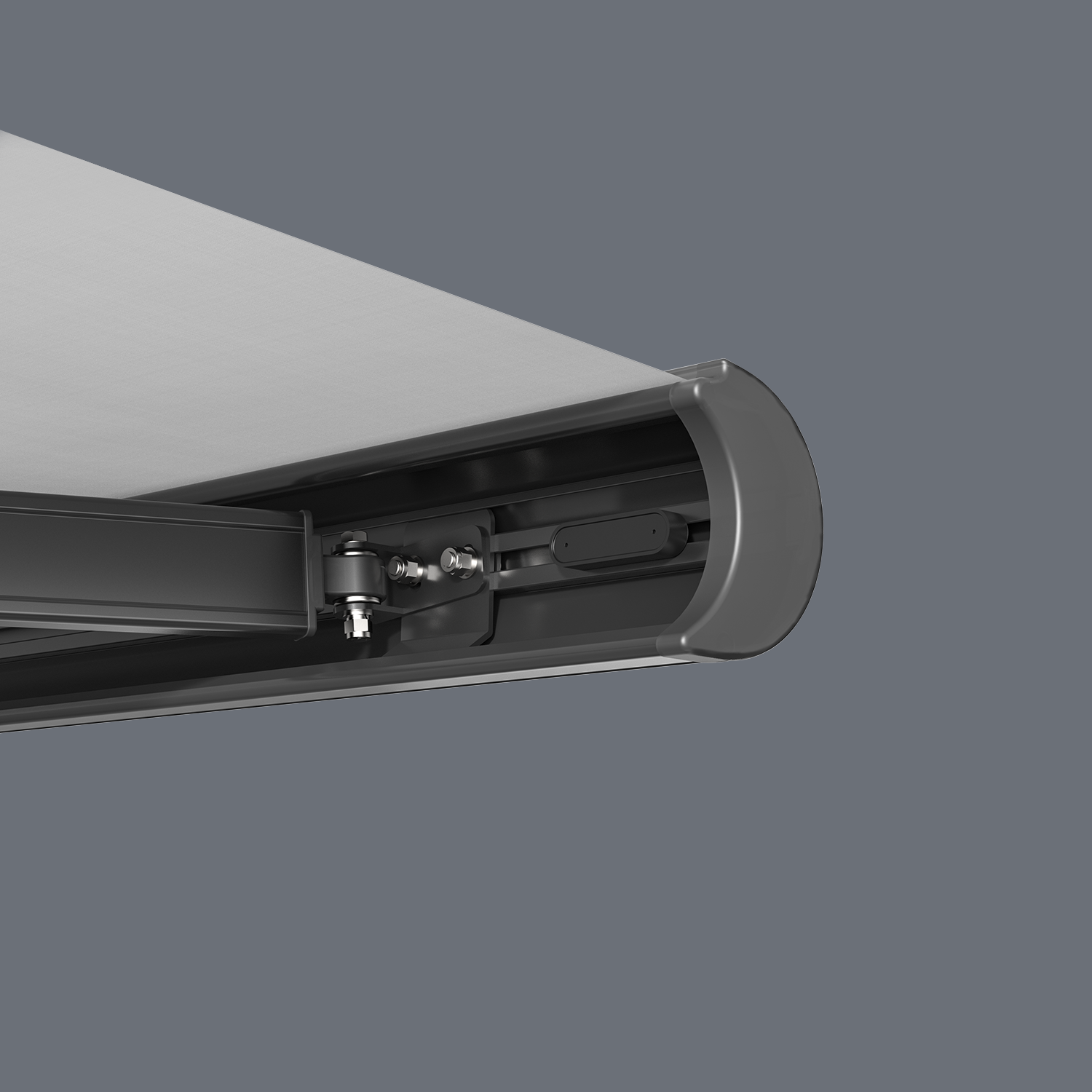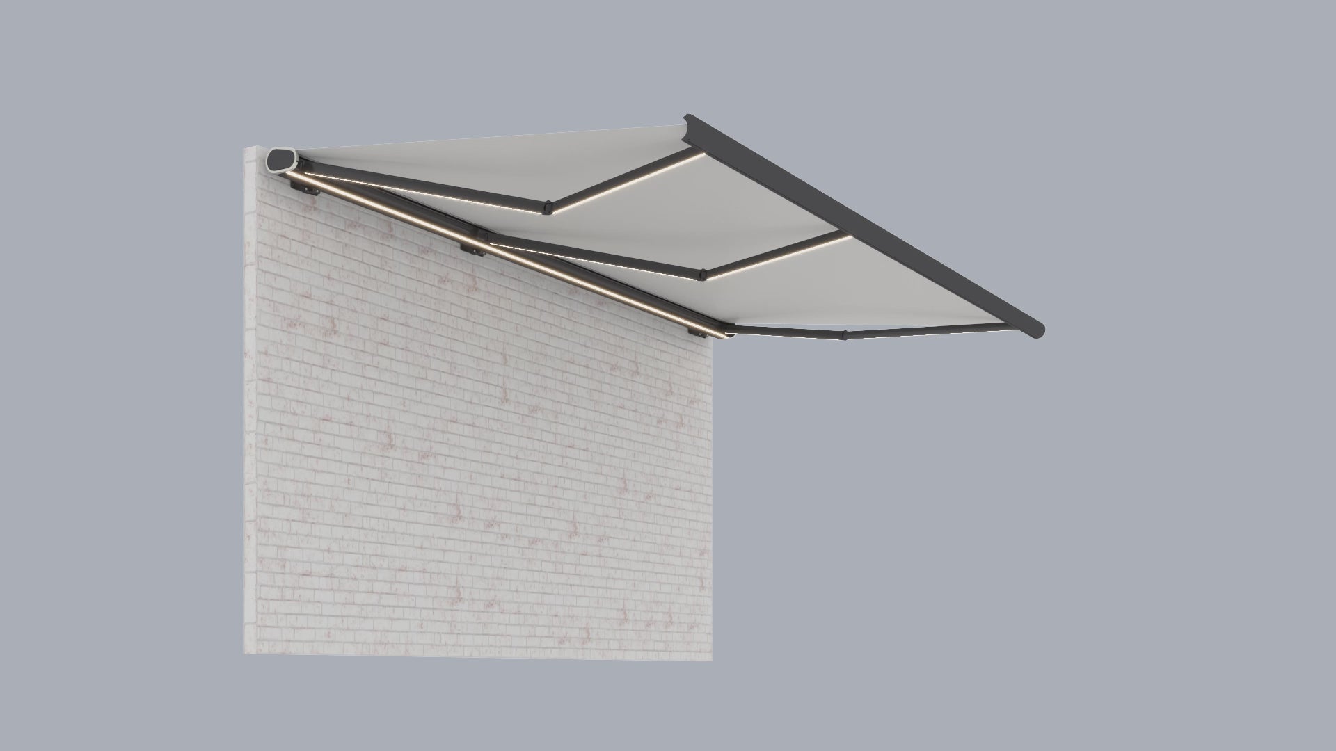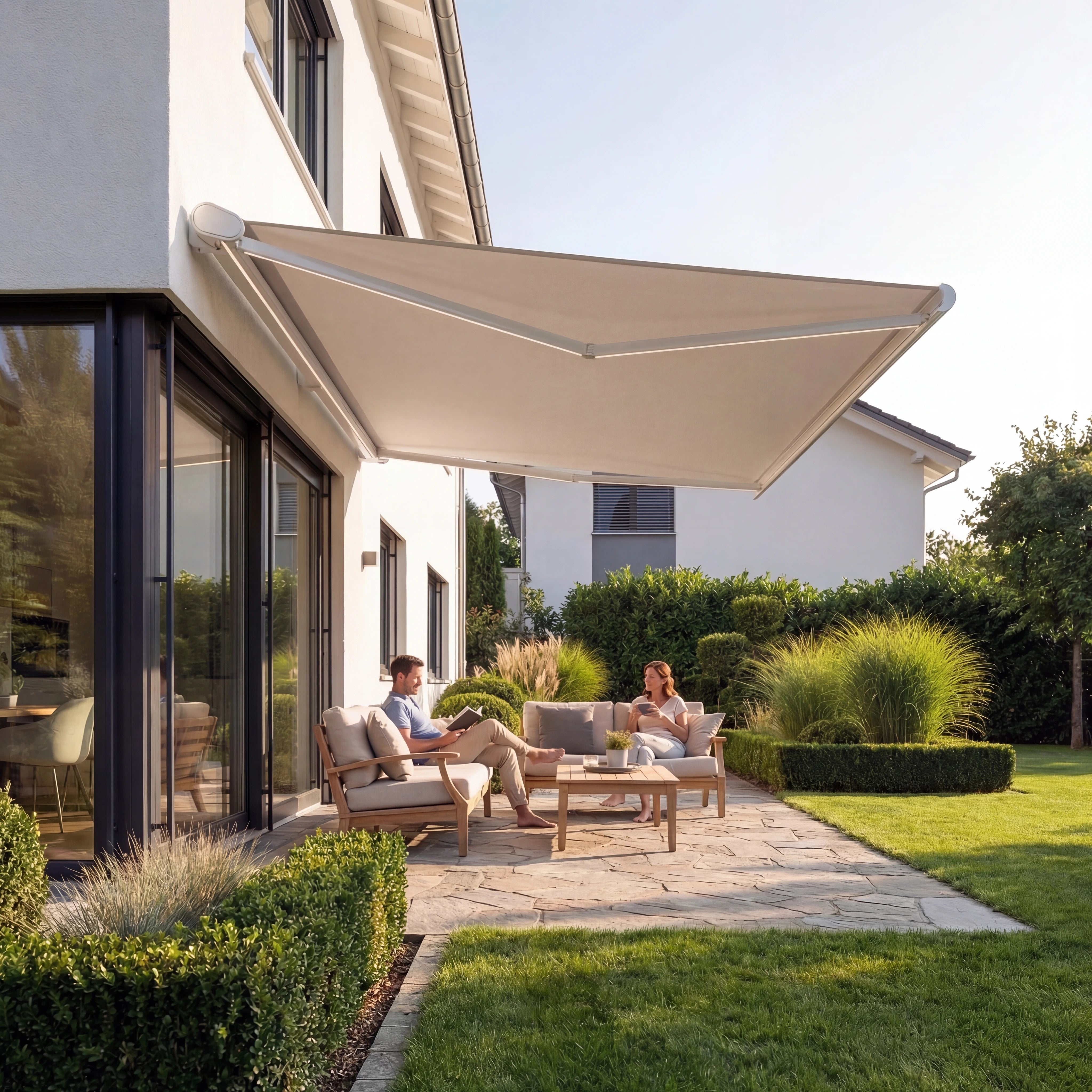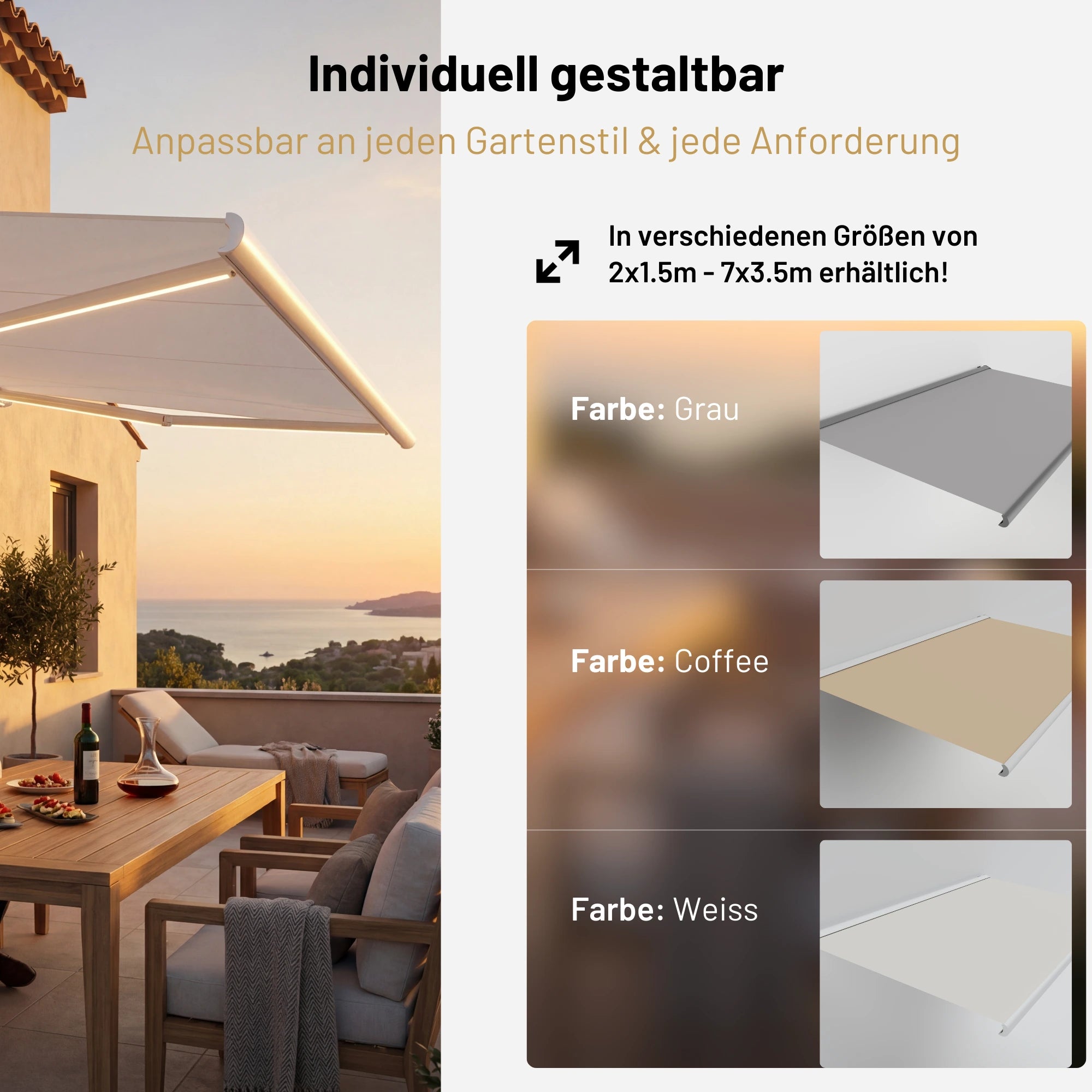 Die Markisen sind in mehreren modernen Farben erhältlich (u. a. Anthrazit, Weiß, Schwarz).